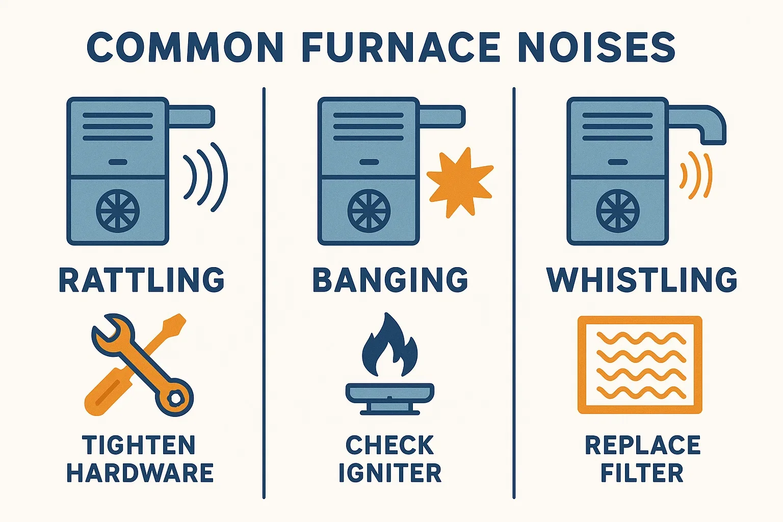 Strange furnace noises often indicate wear, loose parts, or restricted airflow.